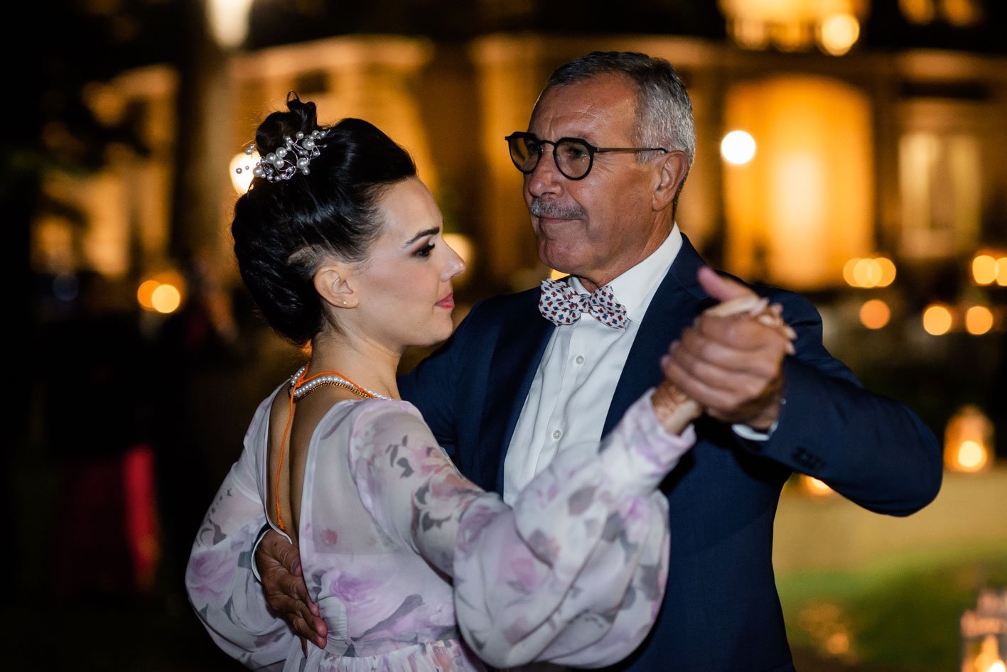 She dressed a silk dress with floral motifs and he was really elegant in his smoking.